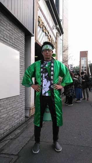 生地は応援ハッピには欠かせない「サテン」の鮮やかグリーンで、目立ってます!