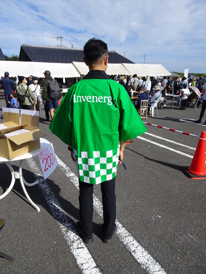 グリーン市松柄の既製法被に企業様名を転写プリントでお入れしました。
