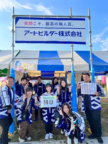株式会社アートビルダー様 「法被は背中で語ります」 でも笑顔は背中じゃ見せられませんのでもう一枚。 本染め反応捺染で染め上がりも皆様の笑顔と同じで綺麗ですね。 「笑顔こそ最高の職人芸」・・・ 刺さる言葉ですね~
