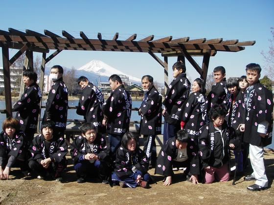 皆さんが心を込めて手作りされる様子を思い浮かべながら私共も1枚1枚丁寧に手染めさせていただきました。お名前どおり「桜」満開の季節が待ちどおしくなるような暖かなお写真をいただきました。富士山をバックに据えて、一足お先に桜が舞うオリジナルの法被が映えていますよ~。