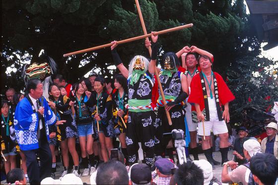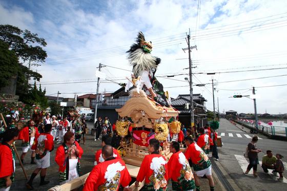真紅の法被をはおった男衆に引かれるだんじりの上には獅子舞が威勢良く舞い踊ります。
