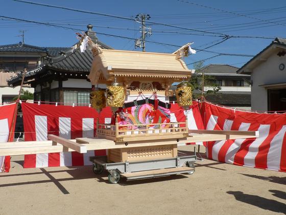 だんじりの写真です。今回新たに祠を巡らせる幕も当社オリジナルで作製いたしました。