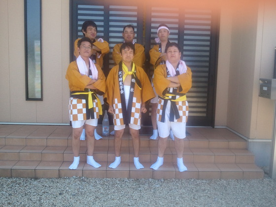 犬ヶ坪亥子会様 地元刈谷市の厄年会の皆様です! 今回は晒を巻きに現場へと参上させていただきました! 法被の色としては珍しい「金茶色」に紬素材もピッタリマッチ!! 秋晴れの最高の天気の中、準備は万端 「行ってらっしゃい~」^^