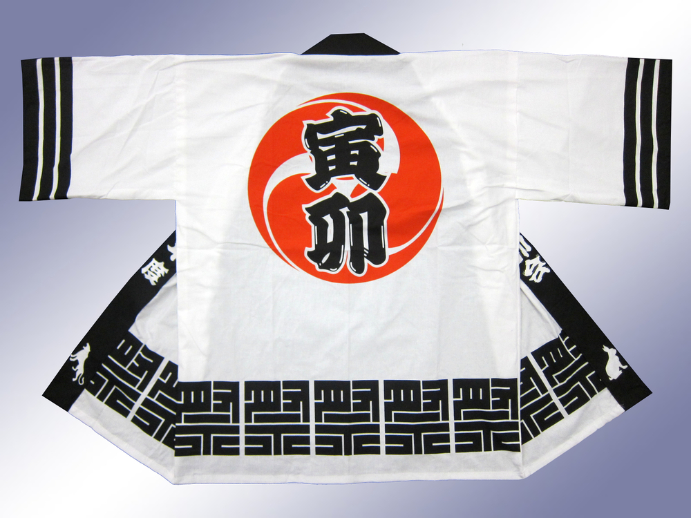 背中には朱色で「左三つ巴」の紋、そして江戸勘亭流で「寅卯」、また腰柄に入っているのは、角文字の「祭」の文字です。両衿に虎と兎のシルエットも入った、こだわりのオリジナルハッピです。