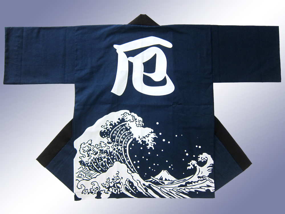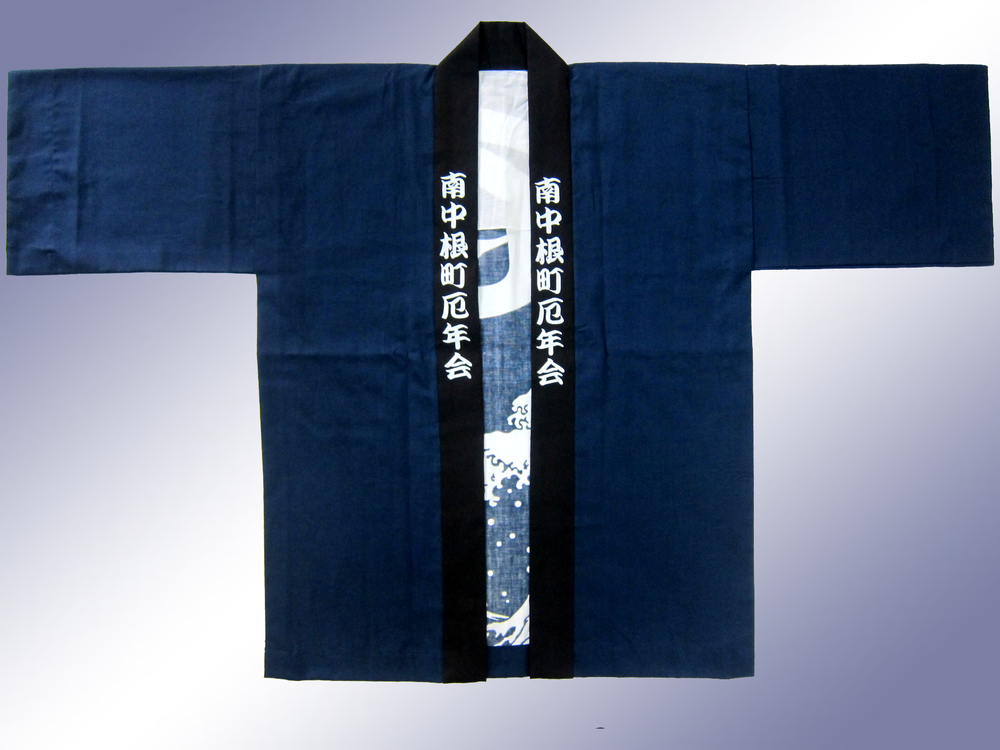 発色の鮮やかなシャークスキン生地に濃紺で本染めをして、文字と北斎波柄は白抜きさせていただきました。