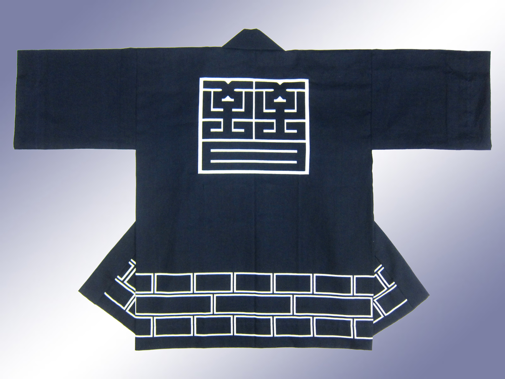 生地は発色が鮮やかなシャークスキン生地を使用、濃紺で本染めして文字と腰柄は白抜きさせていただきました。