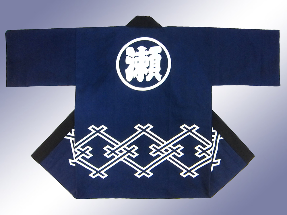 背中に屋号と裾に周り柄を白抜き、藍色染めでいたってシンプルですがこれが伝統的な半纏、法被の王道デザインなのです。合わせやすくて他の人から見てもしっかりと目立ちますよね。