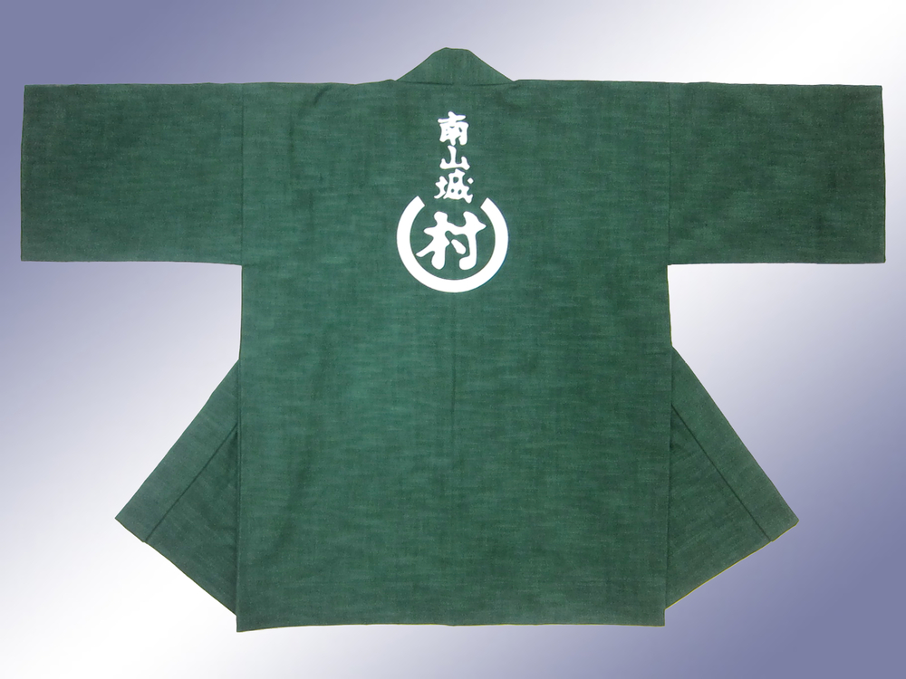地模様に特徴のあるスラブ生地を深緑地に染め、背文字や衿文字を白抜きさせていただきました。
