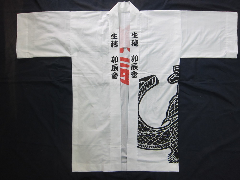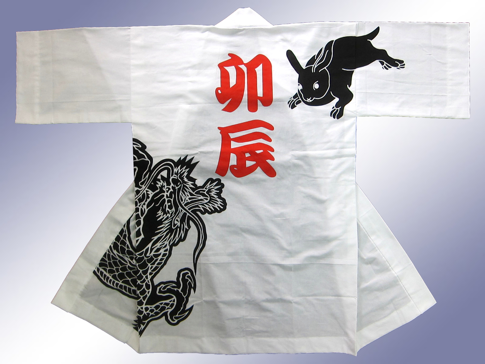 生地は「天竺」という比較的薄めのものを使用し、白をベースに生まれの干支であるウサギと辰のイラストを向かい合うように配置しました。