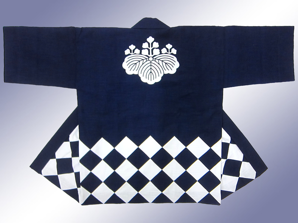 四角が規則正しく並んだ腰柄は「市松模様」と呼ばれます。通常の正方形の市松模様と併せて、法被によく使用される柄です。