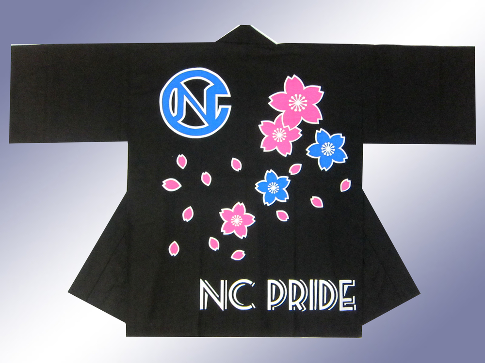 生地は発色性の良いシャークスキン生地を採用し、黒地に女性社員と男性社員を表す桜をそれぞれピンクとブルーで染上げました。