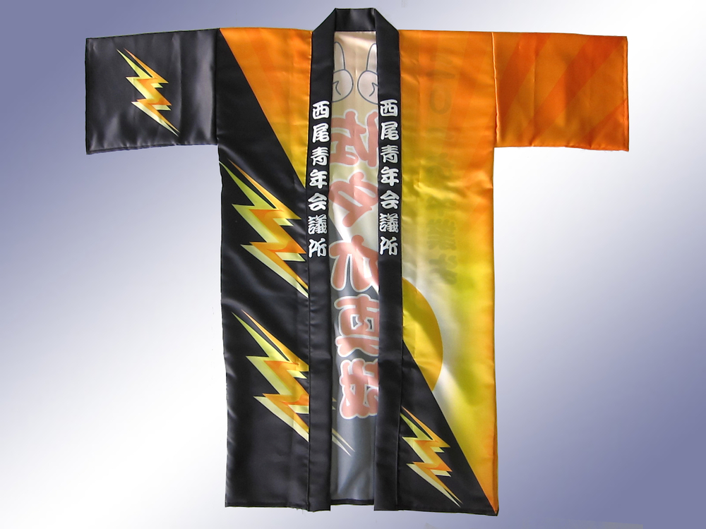 「厳しくも優しい方のイメージを法被で表現したい」、とのリクエストで、「太陽」と「雷」で表現させていただきました。
