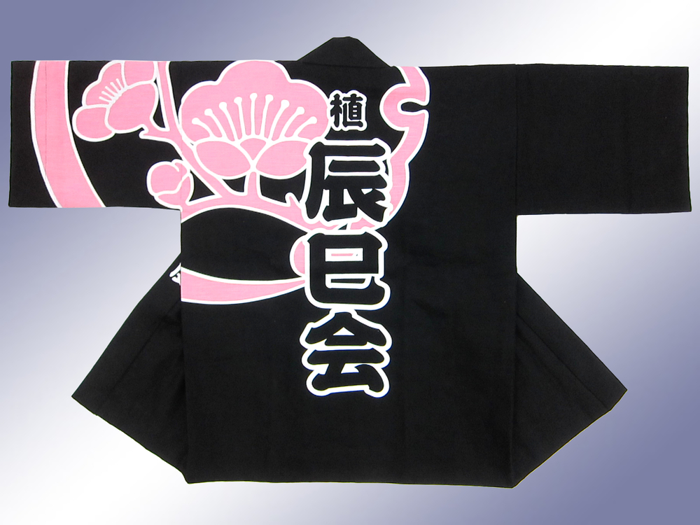 黒地をベースに、阿久比町のシンボルである梅の花のデザインを背中から前面にかけて薄いピンク色で入れました。