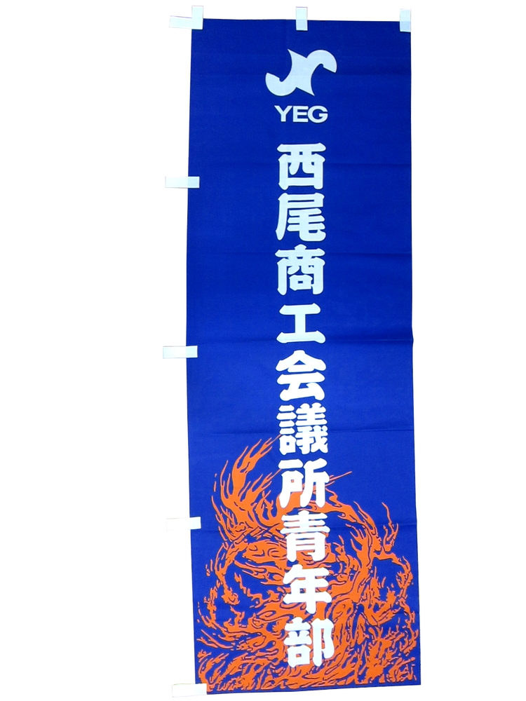 デザインは、青地に炎を用いて青年の燃える魂を表現しています。ハッピだけでなく、のぼりやポロシャツも同デザインで作成させていただきました。
