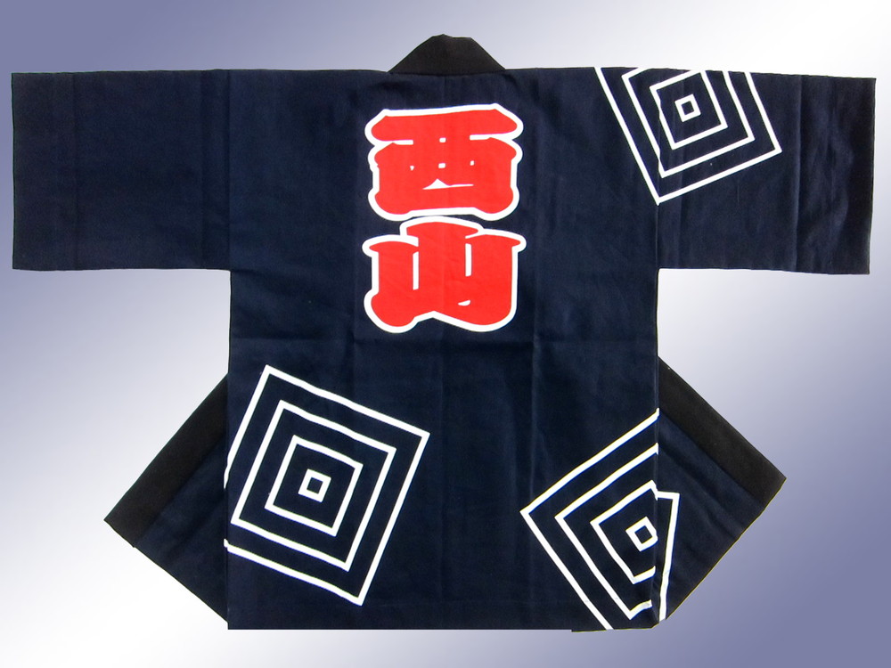 こちらの会の皆様も毎年必ず当社で法被を作成させていただいていますが、今年のデザインはシャープでシンプルですね。四角の合わせ紋が大きく前見頃までレイアウトされ、平面的でない素敵なデザインになりました。