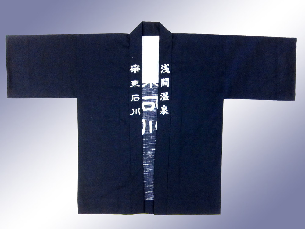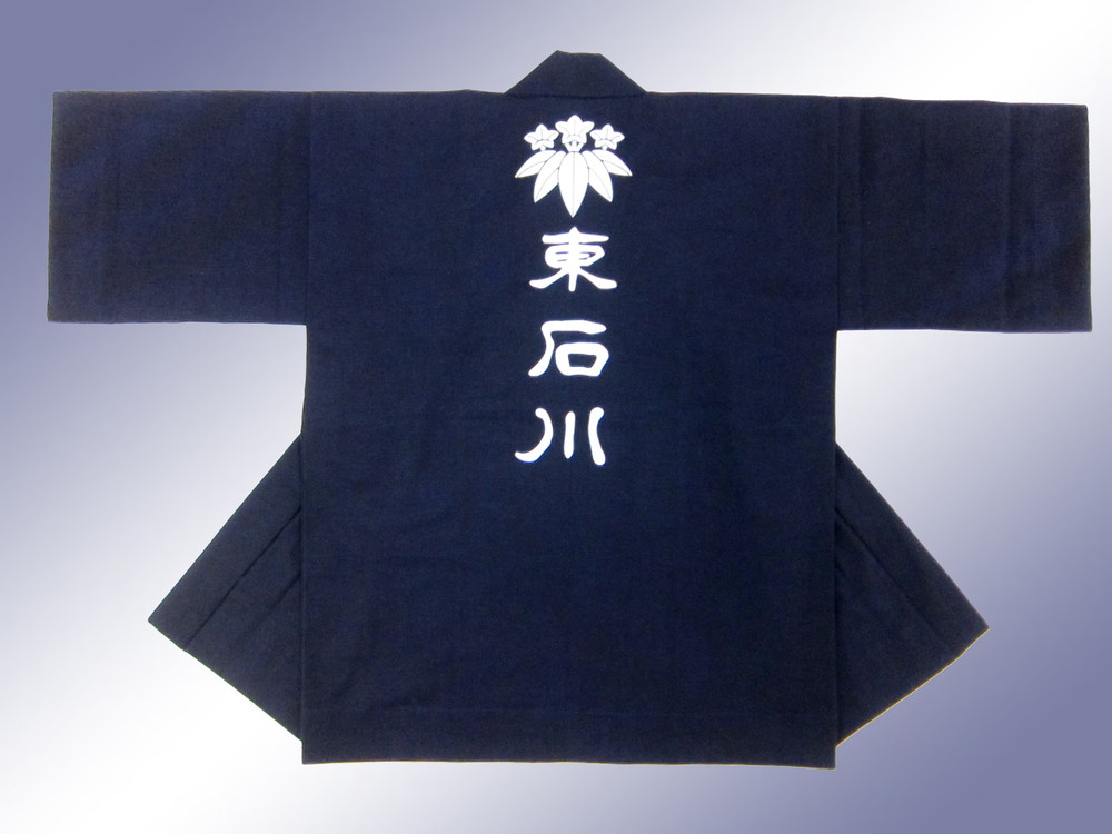 伝統色の「藍色」をベースに家紋(笹竜胆・・ささりんどう)と古くから伝わる屋号「東石川」をデザインそのままに取り込み、白抜きで本染めする、こだわりの印染め法被です。