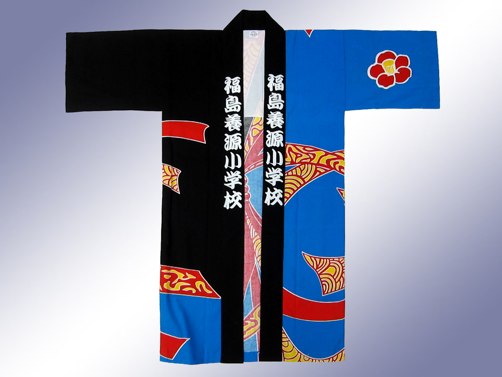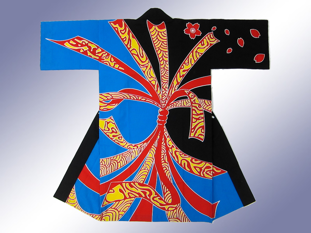 背中に赤と黄の熨斗柄をデザインして、熨斗を境に青と黒に分けました。色鮮やかな法被が出来上がりました♪