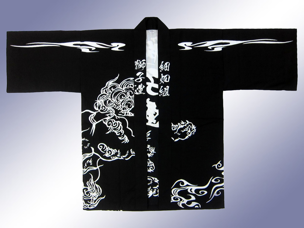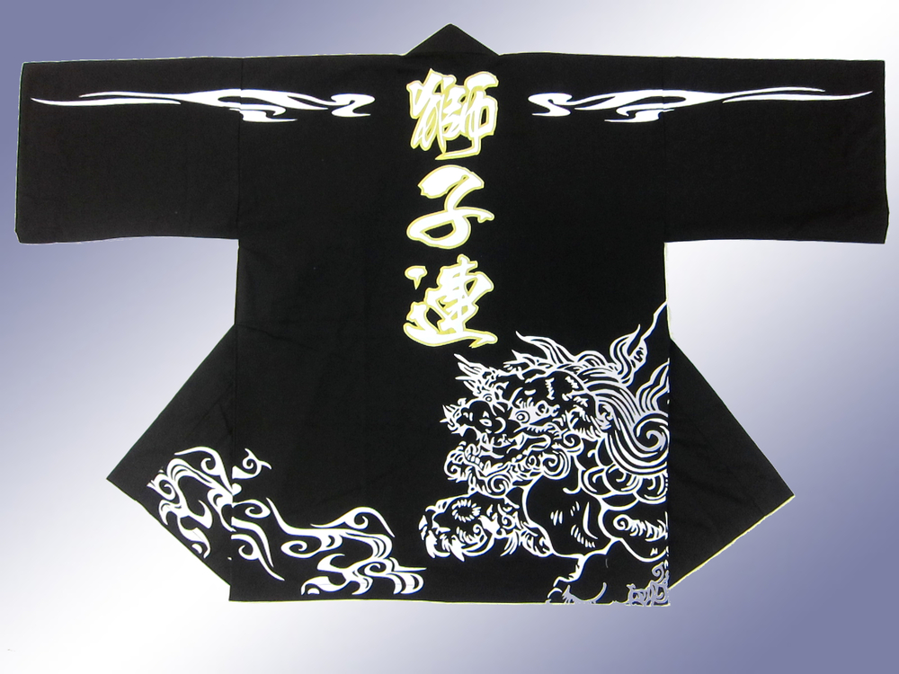 黒にて染め上げて柄を白抜きとし、背中「獅子連」の縁取りを金にてプリントを施して作成しました。