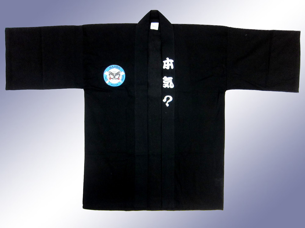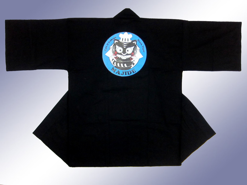 作成方法はイベント無地法被の背中にフルカラー転写プリントでロゴマークを入れてあります。落ち着きを感じさせる黒に可愛くて鮮やかなワンポイントの猫ちゃんが目立ってますよね。