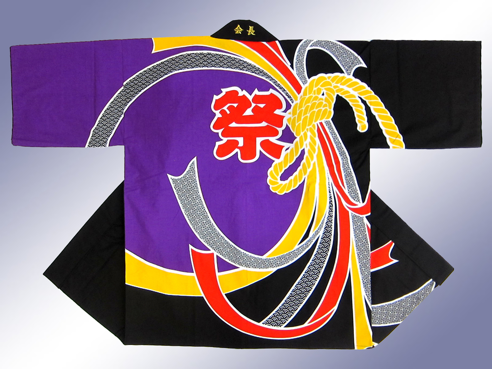 法被本体は、天竺生地にて機械プリントで完全オーダー作成、そして衿文字はその後にゴールドで転写プリントを入れています。