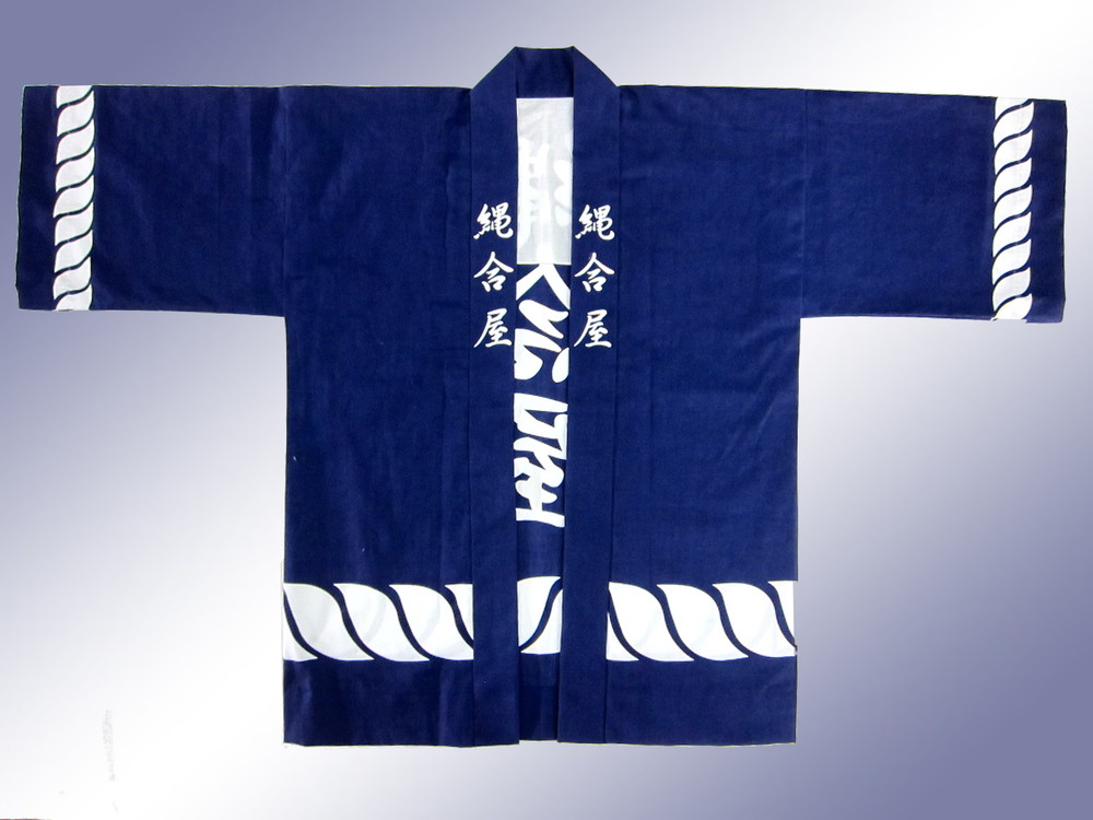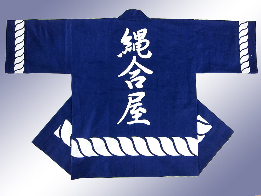 全体はシンプルイメージで遠くから見ても屋号が分かるようにと、お店の名前を中心に、裾と袖の周りはお仕事の必需品のしめ縄で飾らせていただきました。