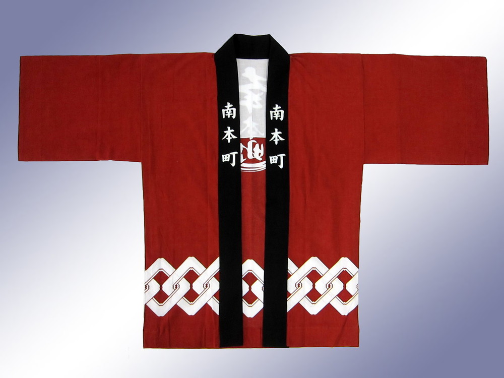 背中の紋章はお客様のこだわりで「南」を筆字のような丸で表現しています。裾には伝統的な和柄の代表とも言える「吉原つなぎ」を配してあくまでもシンプルデザインで作成させていただきました。