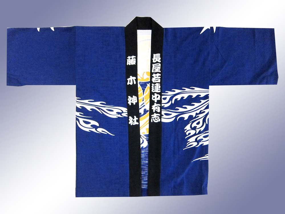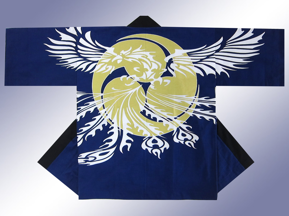 最終的に背紋は金でプリント、紺地に黒衿で、鳳凰は白抜きで決定。
