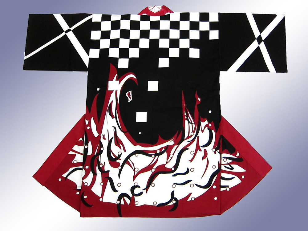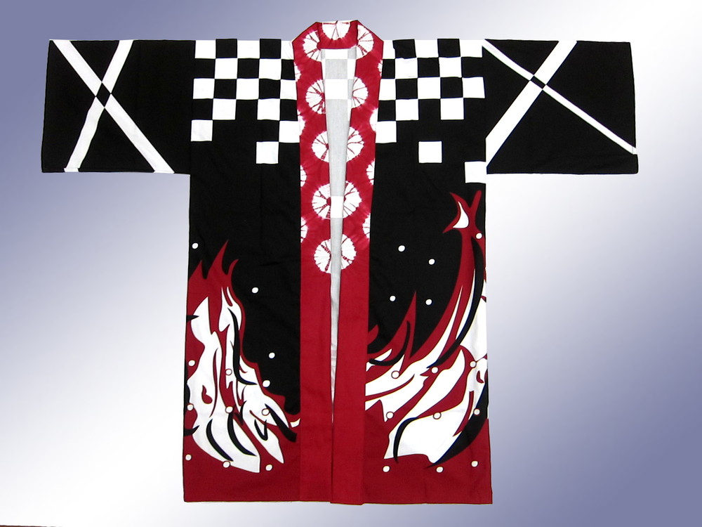 素材は丈夫で発色性の良いシャークスキンを使用、黒とエンジの炎の柄に東京オリンピックをイメージした市松模様がインパクト効かせてますね。身丈も100cmと踊り衣装としてサマになる長法被の完成です。