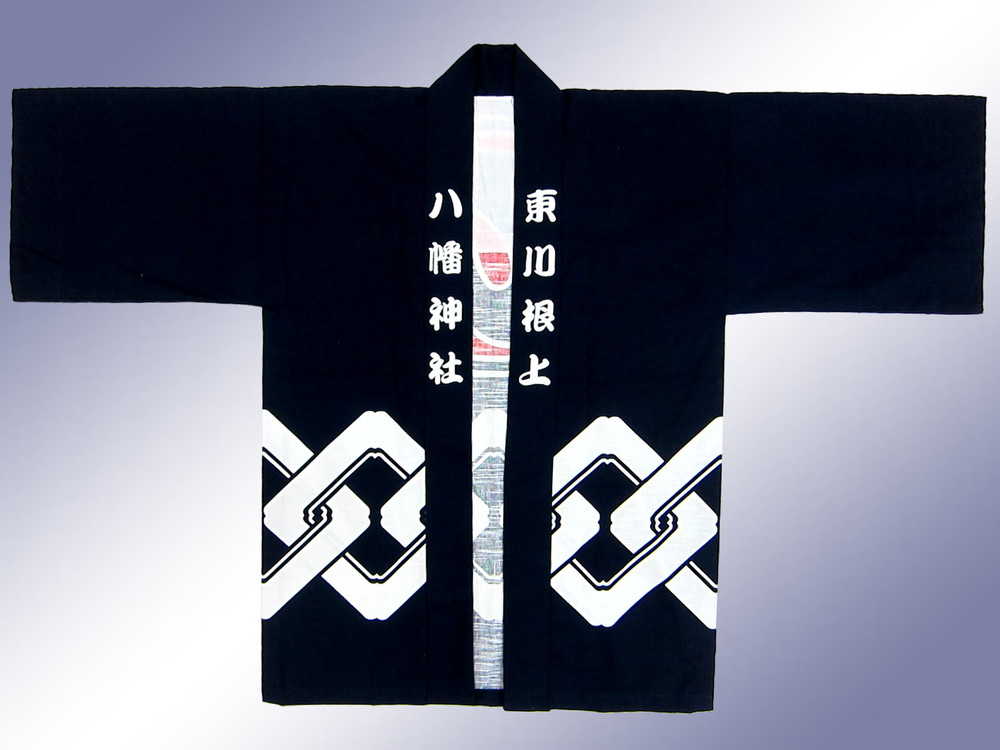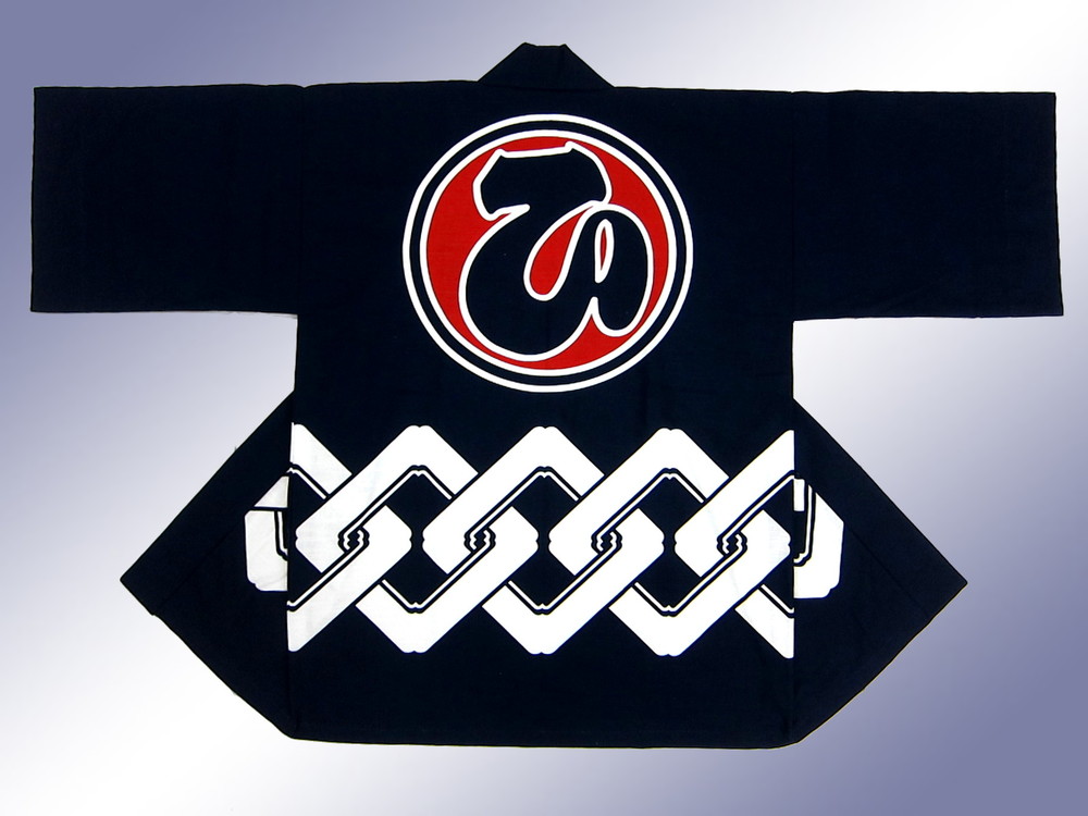 まさに印半纏の定番的デザインですね。配色も濃紺地に赤と白でシンプルですが背中の町内の頭文字の「ひ」が良く目立つデザインです!
