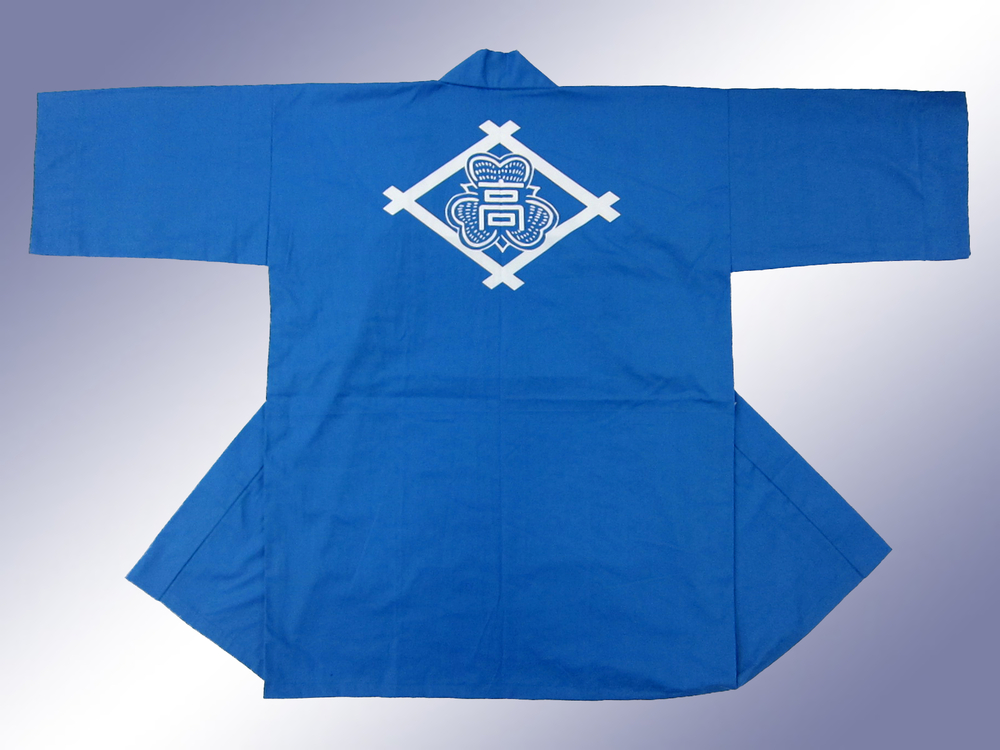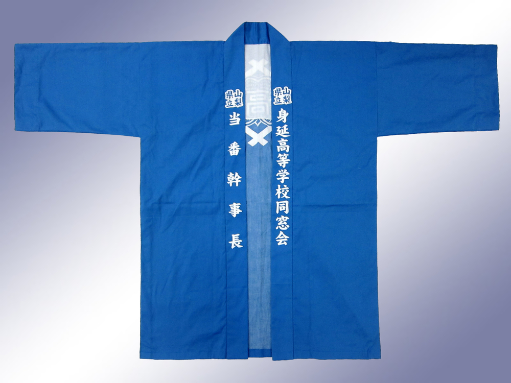 何十年ぶりの再会に向けてお揃いオリジナル法被を作成いただきました。90cmの長法被で生地は通常の綿生地よりもやや軽めの60ブロードです。デザインは校章をデザイン化した背紋であえてシンプルにいたしました。カラーも独特なブルーグレーで落ち着いたイメージが良いですね。