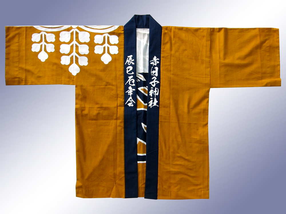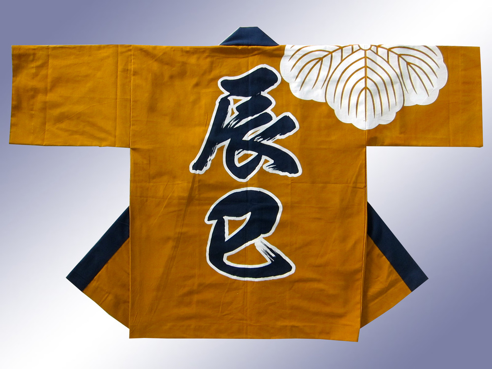 黄土色地に白抜きと濃紺で、神社の紋と背文字に「辰巳」を配置しました。