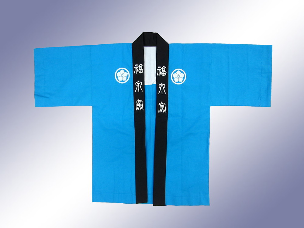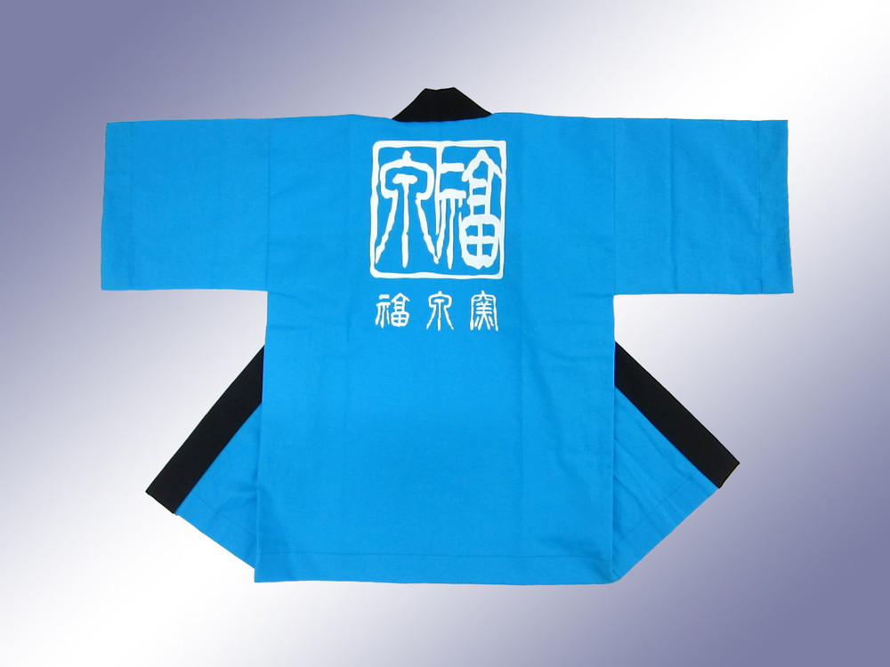 身丈50cm、子供サイズですが本染めにて作成させていただきました。古くからの窯元を受け継ぐ伝統産業として親御様よりのプレゼントにと、当社をお選びいただきました。代々伝わる家紋を胸に、背中には窯元のロゴを取り込みシンプルにデザインいたしました。