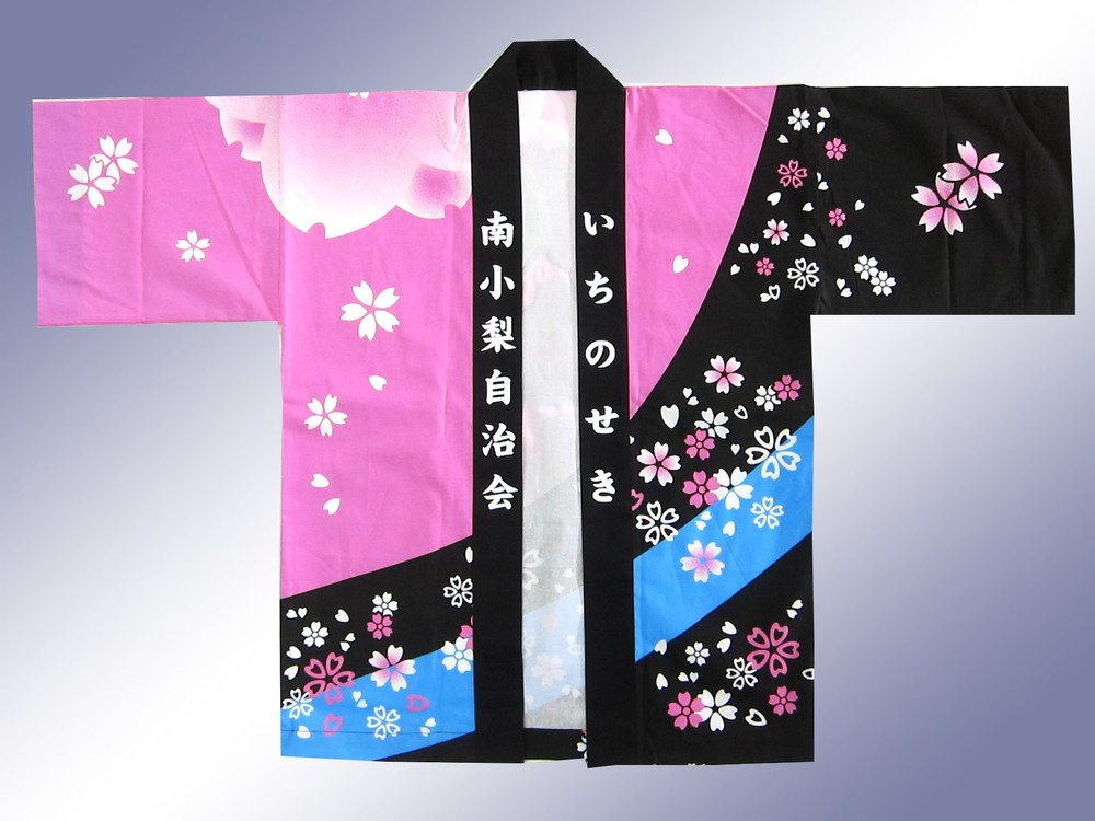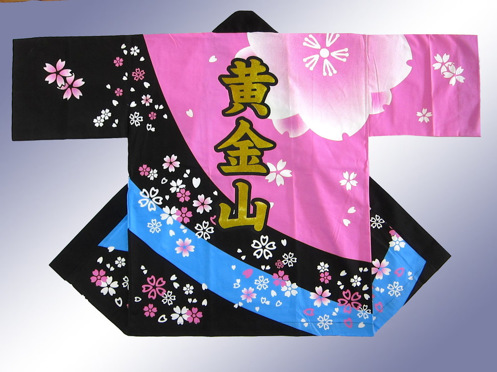 当社カタログ法被に転写プリントで作成いたしました。「黄金山」の名前にふさわしく背中ロゴはゴールドに黒のフチ取りで、法被本体の鮮やかな桜の柄に素敵に映えてます!春のお祭りにこんな素敵な法被を着用されたスタッフの皆様が活躍されるお姿、ぜひとも参加してみたいものですね。