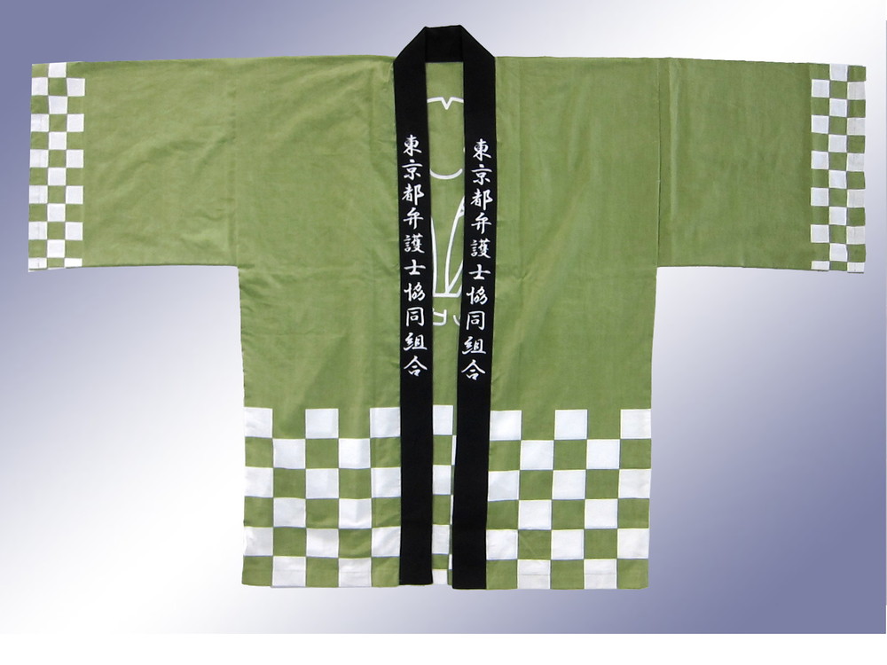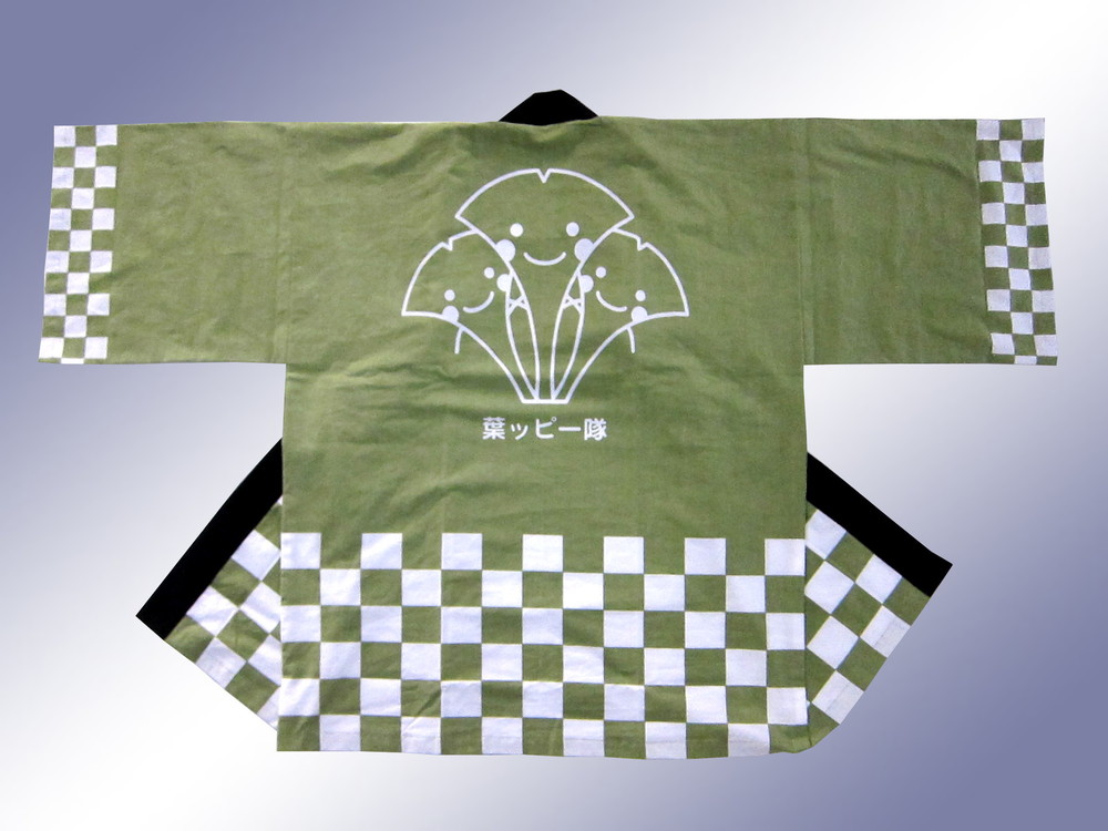 こちら東京都弁護士協同組合さまの可愛らしいキャラ「葉ッピー隊」を背中に特注サイズで作成させていただきました本格本染め法被です。