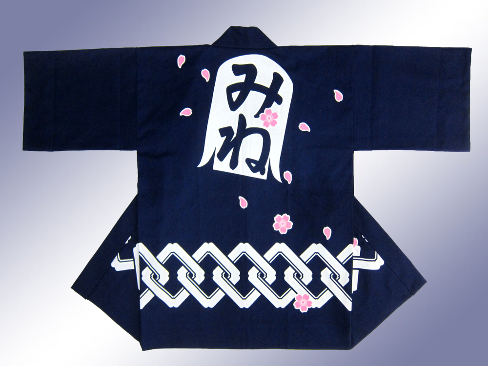 法被の定番の藍紺にピンクの桜の花が舞うデザインがいかにも今の季節らしくて良いですね。裾の吉原つなぎも日本の伝統的な柄ですので背紋のオリジナルロゴがよく目立つレイアウトになっています。