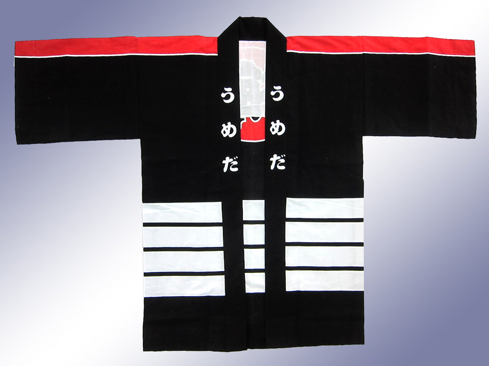 本格的な消防法被デザインを通常の法被素材で完全オーダーメイドさせていただきました。背中の「梅」がご本人の印、衿にもお名前を染め抜いてシンプルですが、消防法被の基本の赤と黒の配色が鮮やかな一枚ですね。