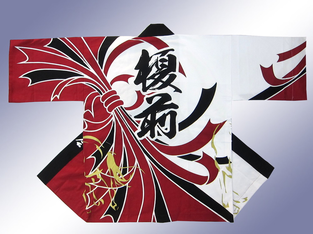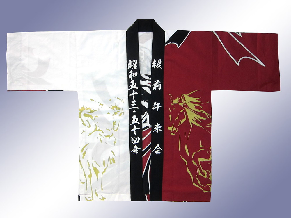 今年のデザインはシャープなイメージの熨斗(のし)柄切り替えを本染め作成して、お腹の部分、前から背中にかけて今回の干支「午(うま)」と「未(ひつじ)」を金プリントでデザインしてあります。