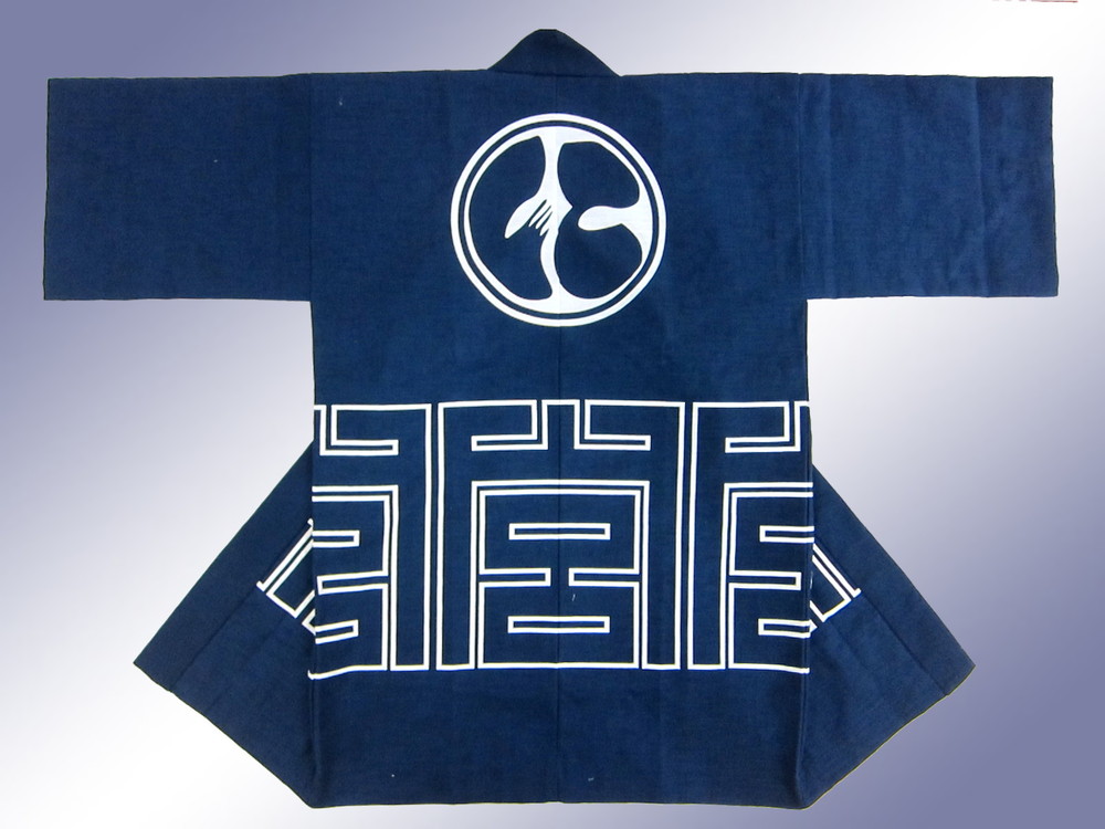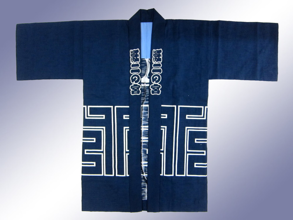 背中の大紋の「に」の文字と腰周りの角文字「宮」で地名の「二の宮」と読んでください。昔ながらの法被にはこういった文字や柄で言葉を表現する粋な文化があるのですね。
