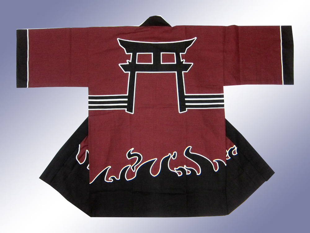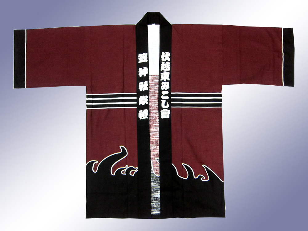 エンジ地に黒での2色使いの法被で、こちらは依頼者の弟様がデザインされたものになります。