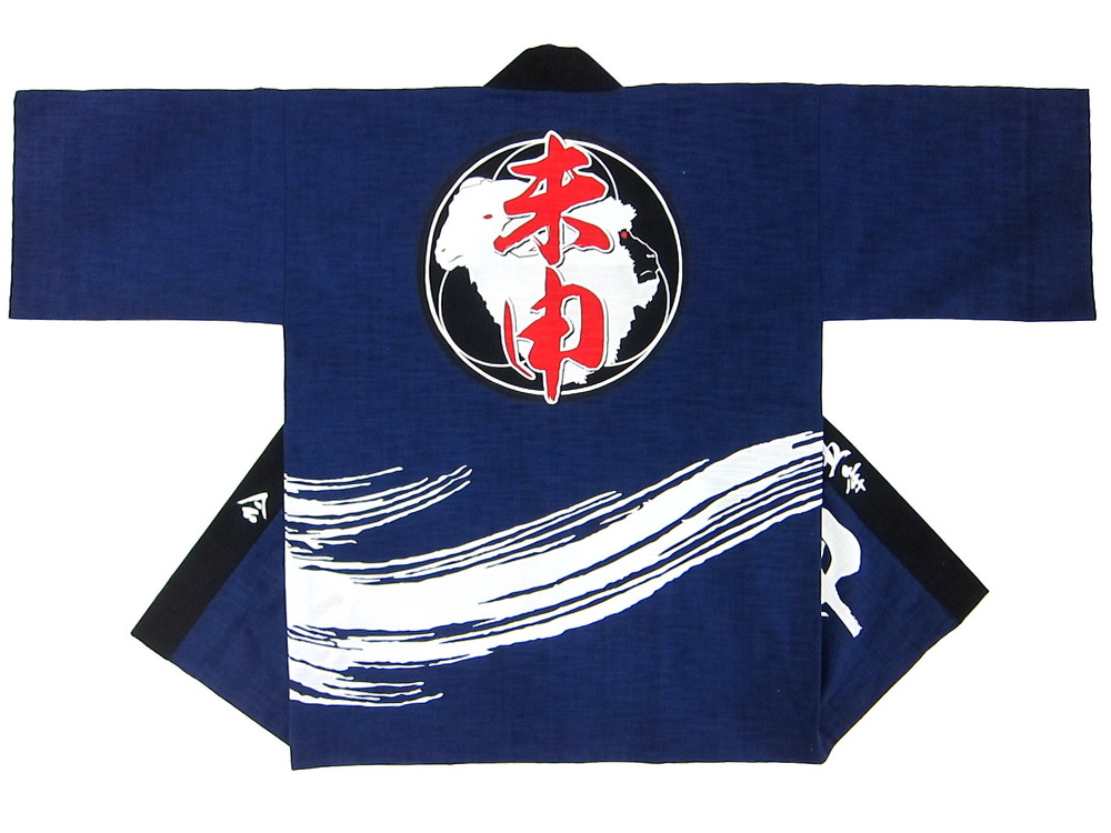 背中の未(ひつじ)と申(さる)を合体させたイラストと風のような筆書きがオリジナリティあふれる素敵なデザインに仕上がっています。