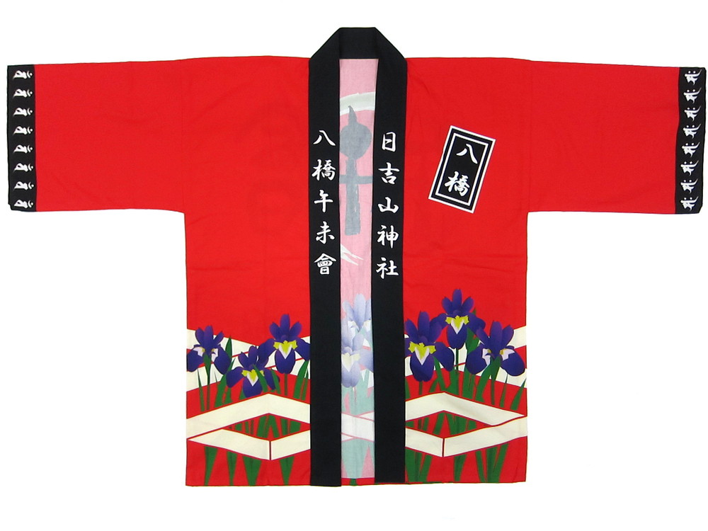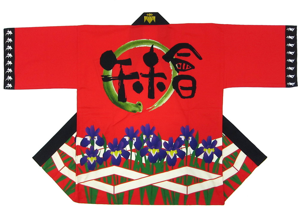 当社では通常の綿生地(シャークスキン)でも染料を使用したインクジェットプリントにての作成をいたしますので、このような多色デザインでも普通の染め法被に近い風合いでお届けが可能なのです!