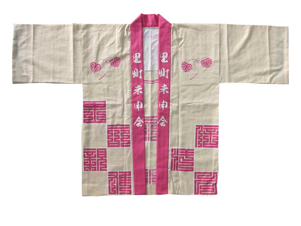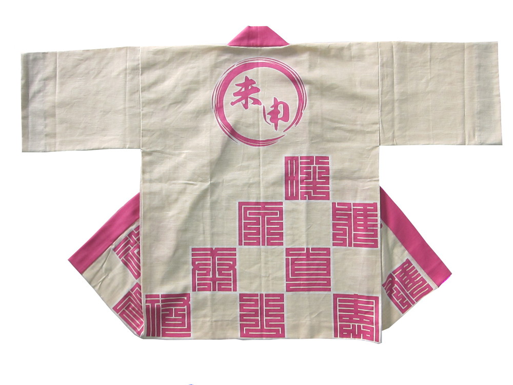 胸元の大紋は神社様の家紋である「二葉葵」をあしらい、全体に角文字を散らせた粋なデザイン、もちろん染めは「本染め」できっちりと職人の手による仕事です!