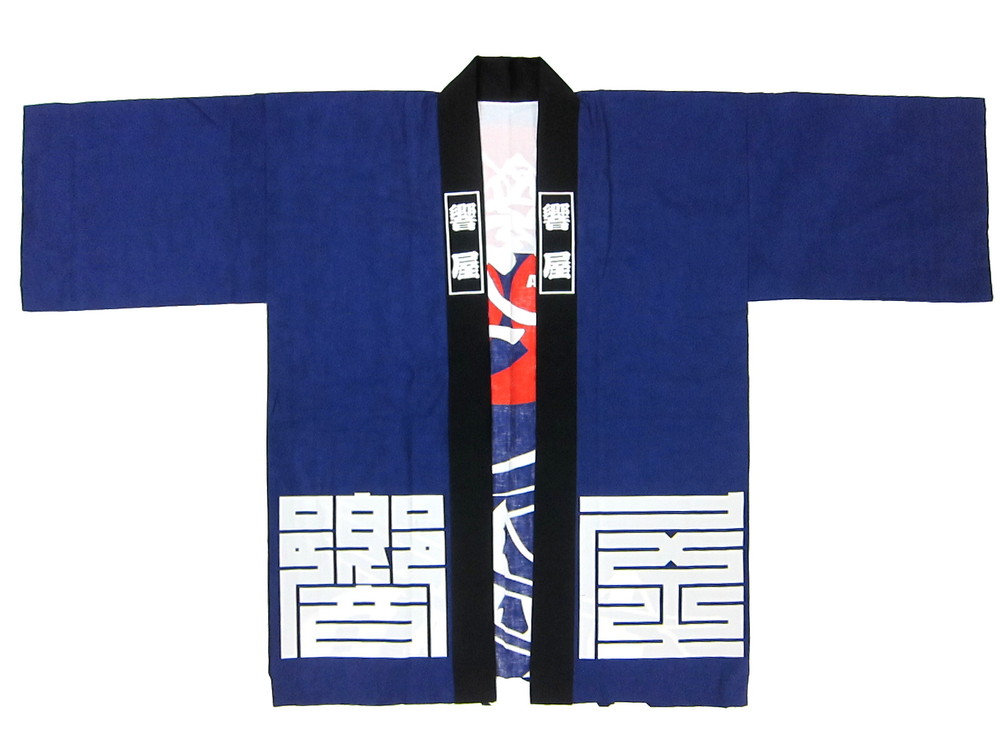 落ち着いた濃紺色に三つ巴紋の赤が鮮やかに映えています。