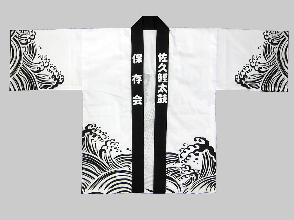 法被の定番素材であるシャークスキンで作成方法は「本染め」、太鼓のばちさばきに合わせて舞うような柔らかな風合いはお約束です!