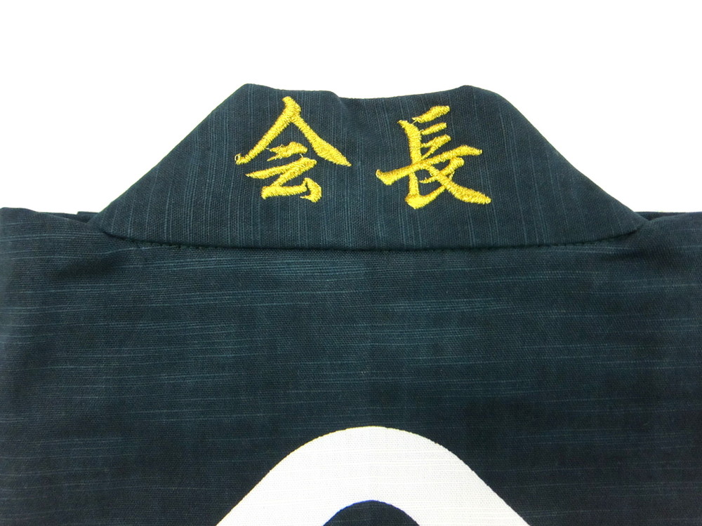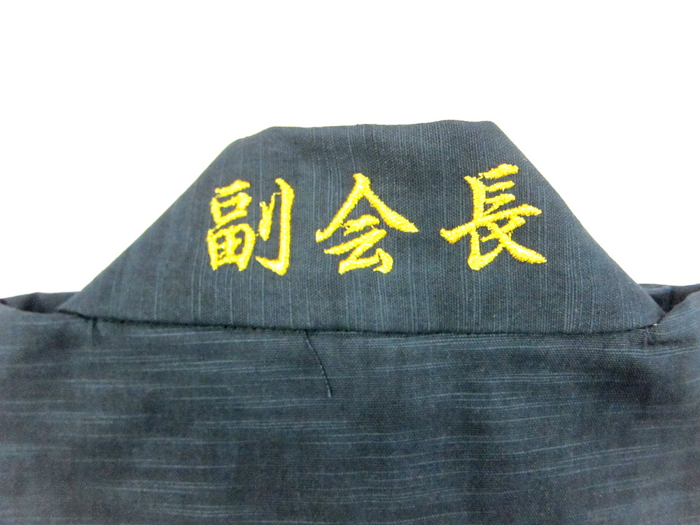 法被jpでは刺繍もお客様のご要望でお入れさせていただきます。今回は厄年会様の「会長」「副会長」様専用のオリジナル法被を作成させていただき、衿の首部分に後から金糸でそれぞれの文字を刺繍いたしました!