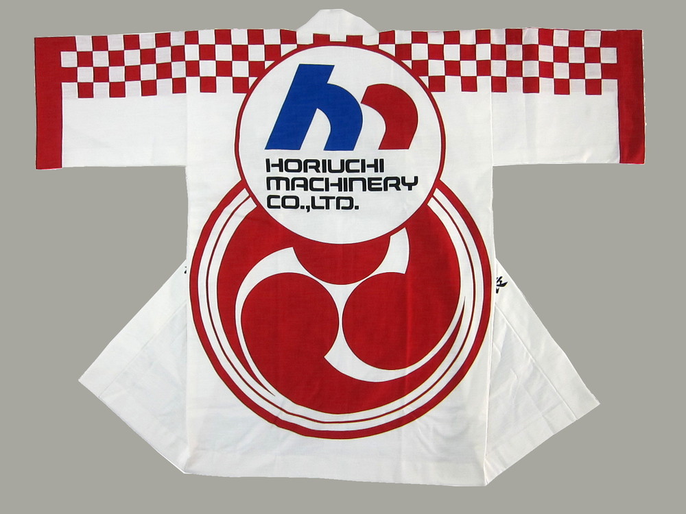 会社のロゴと三つ巴紋をマッチングさせた大胆なデザインですね。法被の丈も思い切って100cmと成人男性の膝小僧あたりの長さにしてみました。