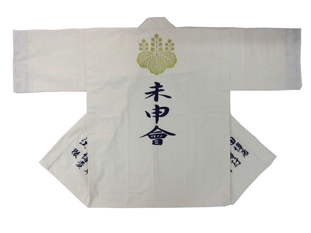 生地は和風な素材感で人気のスラブですが、今回使用したのは白でもなく色でもない、生成り生地に顔料で本染めをいたしましたので、また一味違った雰囲気のあるオリジナル法被になりました。