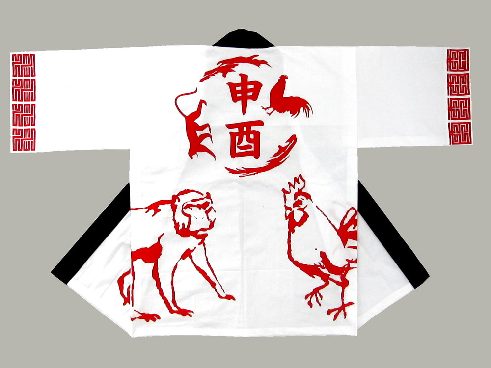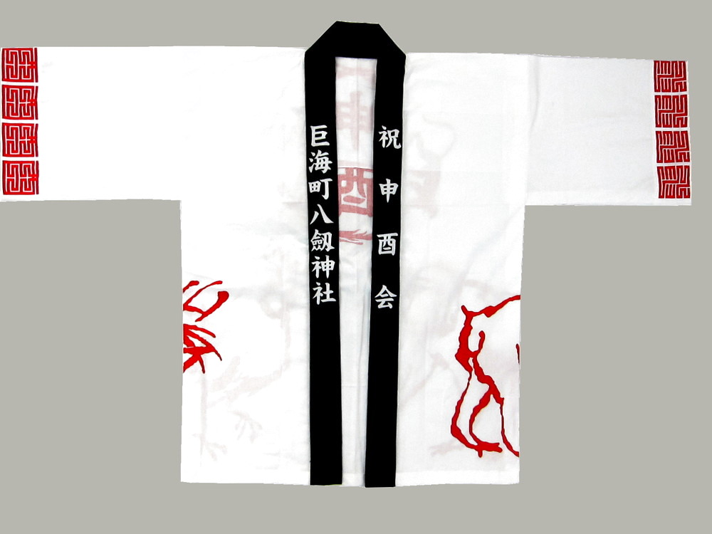 神社仏閣・厄年会様 巨海申酉会様 西尾市にある巨海(こみ)町の厄年会の皆様にも毎年法被を作成させていただいています。 今年は今までのデザインと被らないように、白をベースに申(さる)と酉(とり)のイラストを裾柄に、背紋にもシルエットで2匹を配置してありますよ。 染めは顔料を使用した職人による本染めでより赤を鮮やかに、生地は薄すぎず適度な風合いの天竺を使用していますので着用感もバッチリですね。 この法被で厄年を楽しく頑張って過ごしてくださいませ~♪