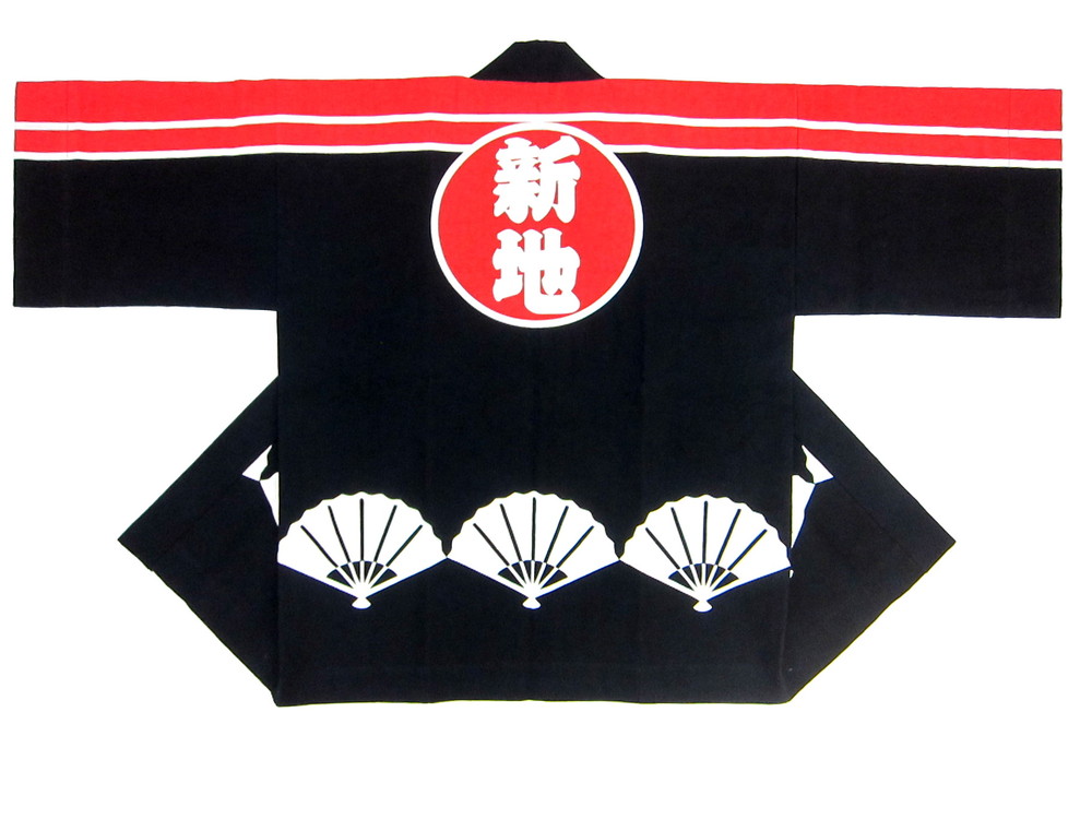 デザインは通常の消防団用法被をベースに、裾の白ラインを「扇子」に変えてあります。