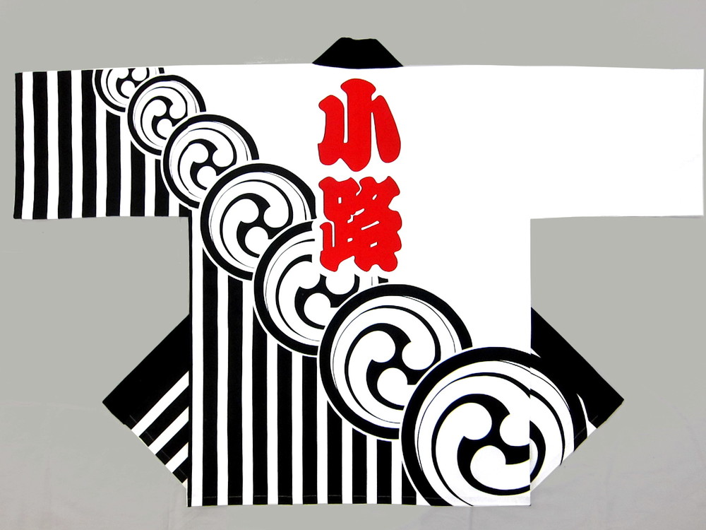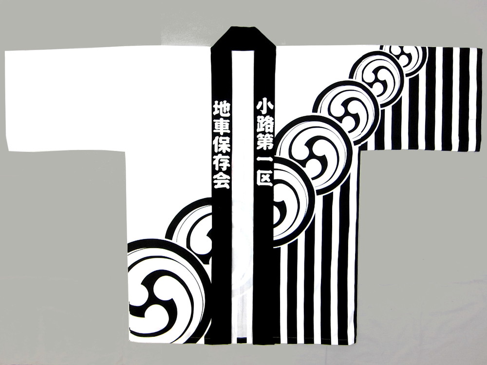 同好会・保存会様 小路地車保存会様 大阪寝屋川市の小路地区町内会様のお祭り用に新調させていただきました。 三つ巴の紋を黒のストライプと合わせた切り替え柄に背紋の地区名を赤で載せてよく目立ちますね! 素材は厚めで丈夫な生地本カツラギを使用しています。 これから町内様でのお祭りにじゃんじゃん着用しちゃってくださいね♪